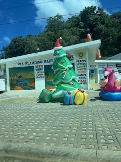 10. Funny cultural differences. I present this one with every ounce of self awareness as possible. I realize that if I was Costa Rican and I came to the United States I would find certain thing incredibly funny, both haha funny and just … funny. The same is true for me here. For example, T-shirts. English language T-shirts are kind of the rage around here, but it doesn’t seem to matter what is printed on the T-shirt. Case in point: a Deloitte T-shirt on our green grocer bagger. The tank top on a 50-year-old man that reads: Namaste Bitches or I AM The Wolf. Another example: Christmas! In the US Christmas begins in earnest after Thanksgiving. So I was surprised to hear Christmas music on the radio in early October. But not full-on Christmas music, because (I conjecture) the season is so long there just wouldn’t be enough Christmas music to fill all that space. So just about one song in four was addressing the bells ringing over Bethlehem. The subsequent songs would be talking about sexy ladies dancing a la King Africa’s La Bomba, which I found totally disorienting. Along with the snow on the Christmas decorations and the really hot post-rainy season weather. I just couldn’t make it work in my mind. And yes that is Santa on a flamingo in the picture below!