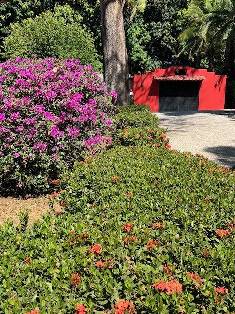 6. The colors. You can kind of tell where gringos have moved in because our houses are all boring white, gray, and maybe green. But Costa Ricans match the interiors and exteriors of their buildings with the showiness of the flowers and jungle birds. I was reading something about how this keeps heat out, but that sounds a little suspect to me. I think that the fluorescent pink, bright red, turquoise, yellow, ochre, bright blue are just the colors that make sense with the landscape here. I was searching for my favorite neighborhood house when I realized that I actually have a great example, which is my house. I love the grounds of our house as they are lush, peaceful and, of course, colorful.